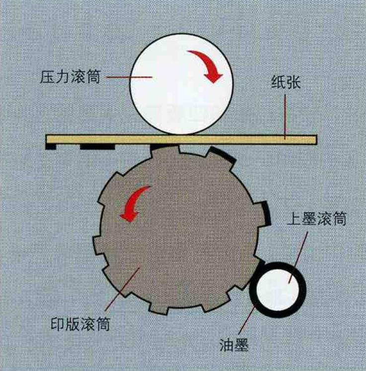 印版上所有印刷图文部分突起且高度相同,空白部分凹下。印刷时,突起部分着墨,直接压印到承印物上。