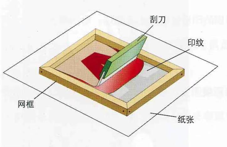 将印版覆于承印物上,在版上刮墨,油墨即从图文区域的网孔中漏下,形成印迹。